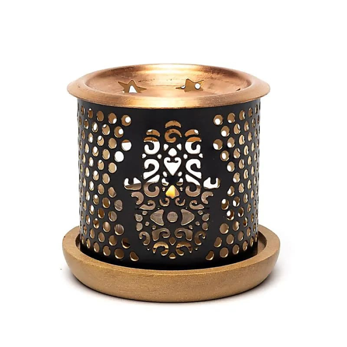 Acest difuzor de tămâie exotică este format din: difuzor din fier forjat, placă/farfurie de cupru, coaster din lemn, lumânare, două mostre de tablete de tămâie (parfumul variază în funcție de cutie).