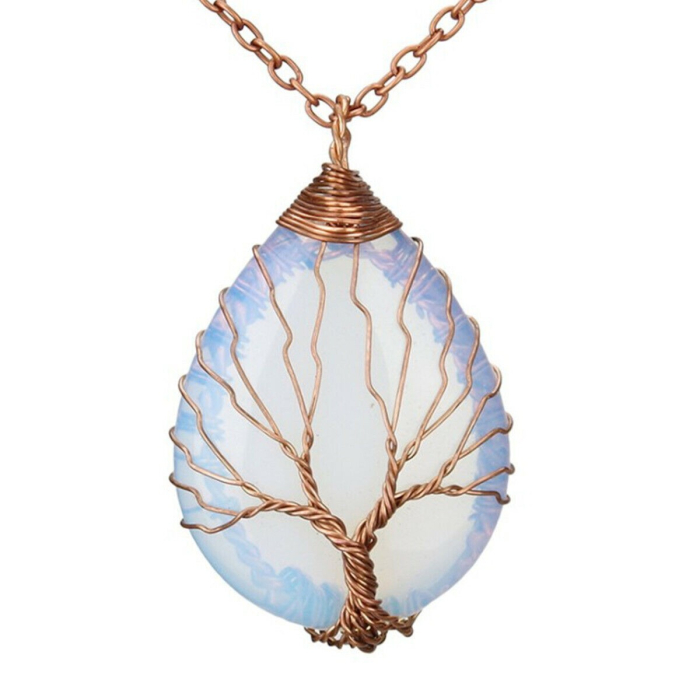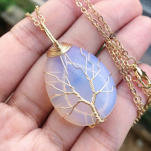 Colier cu pandantiv din cristal Opalit, șlefuit în formă de lacrimă (4.2 cm), montură aurie tip Arborele Vieții și lanț auriu din oțel inoxidabil 45+5 cm. Bijuterie cu aspect opalescent, asociată cu claritatea emoțională și energia pozitivă.