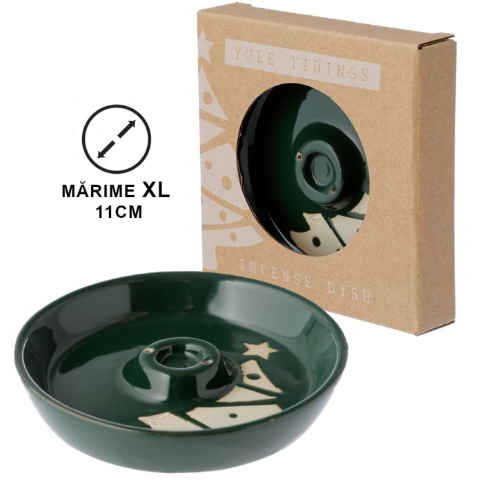 Suportul pentru arderea bețișoarelor parfumate și a conurilor, decorat cu brad de Crăciun, vine ambalat în cutia proprie, gata pentru a fi dăruit .