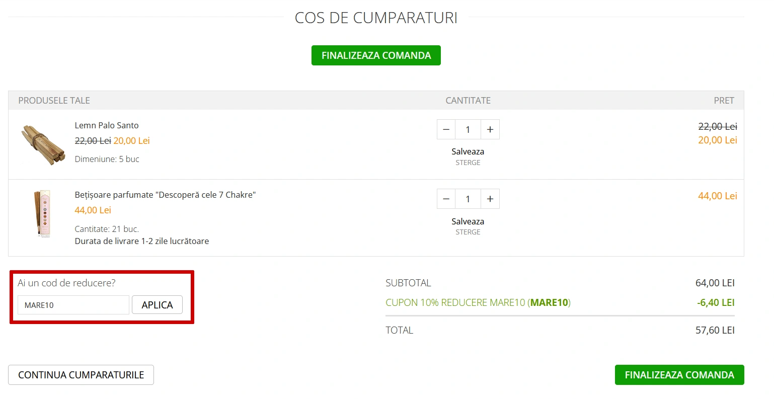 1. După ce ai adăugat în coș toate produsele selectate, accesezi Coșul de cumpărături și cauți zona pentru cuponul de reducere în partea stângă, jos, ca în imagine: